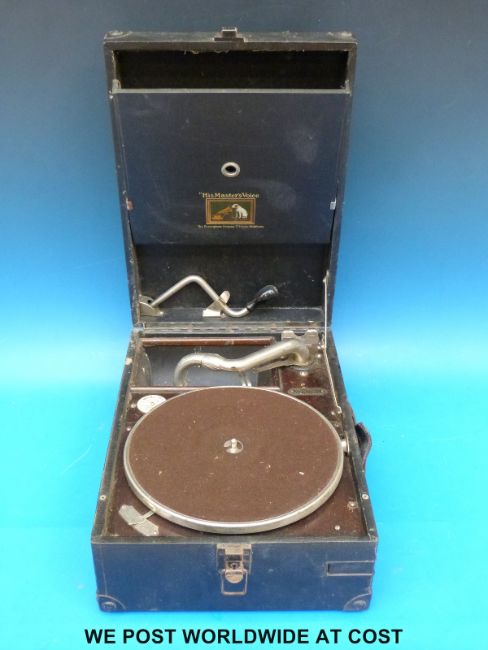 A portable vintage HMV model 101 wind up gramophone in black 'Rexine' finish