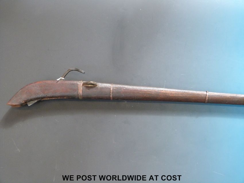 A Chinese approximately .25 calibre matchlock gun with copper banding and 38" barrel flared to the muzzle, overall length 119cm