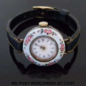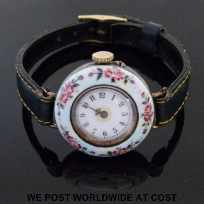A ladies wristwatch decorated to both sides of the case in enamel with roses and pansies, with Arabic numerals and gilt detail to the face, case diameter 28mm.