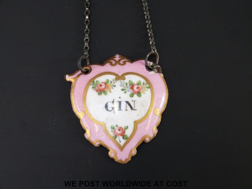 An 18thC Bilston enamel wine label for Gin with painter's mark verso