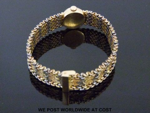 Beuche Girod 9ct gold ladies wristwatch with gold hands and baton markers, on tri-colour bracelet stamped RCK, case diameter 16mm, 33g.