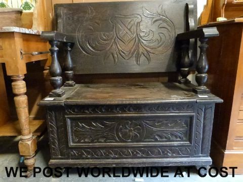 A carved oak monk's bench (H95 x W86cm x D43cm)