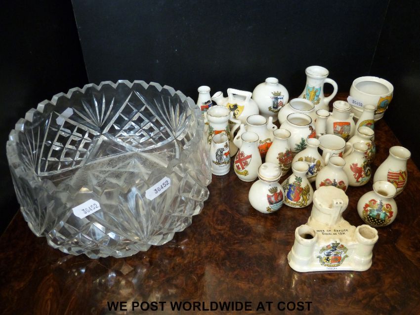 A small quantity of crested ware including Goss, Crown Devon and Foley (Shelley) and a cut crystal bowl