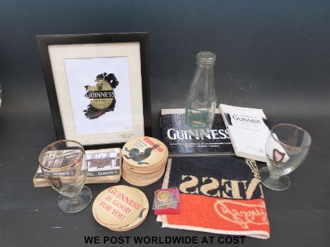 A quantity of Guinness memorabilia to include 1955 gold rimmed Waterloo glasses, Guinness dairy bottle, early beer mats, tokens etc
