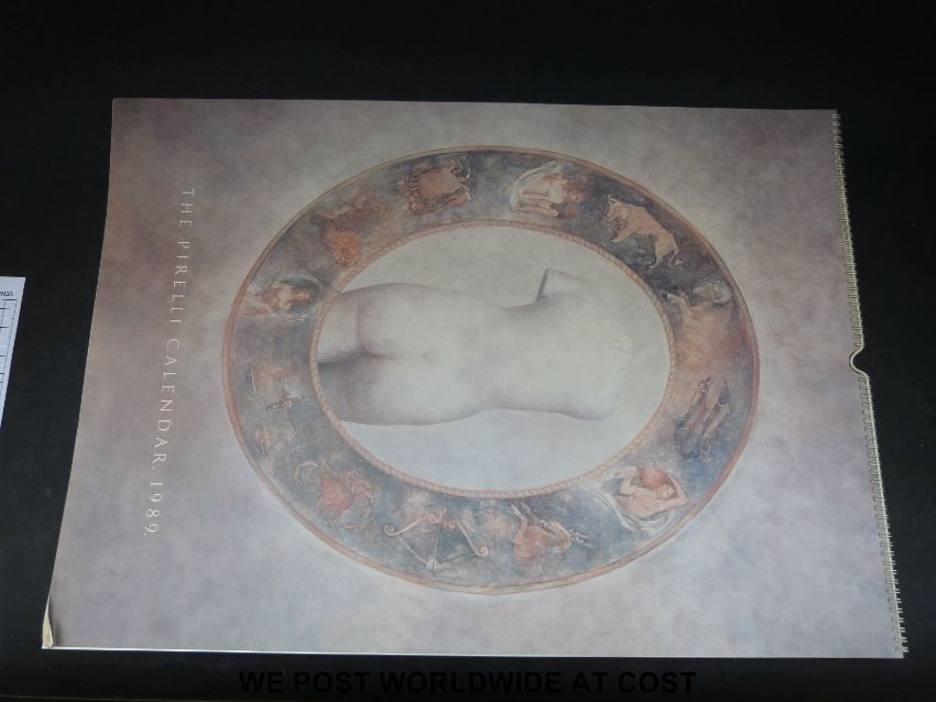 A collection of eleven Pirelli calendars from the 1980s-1990s, each in cardboard casing