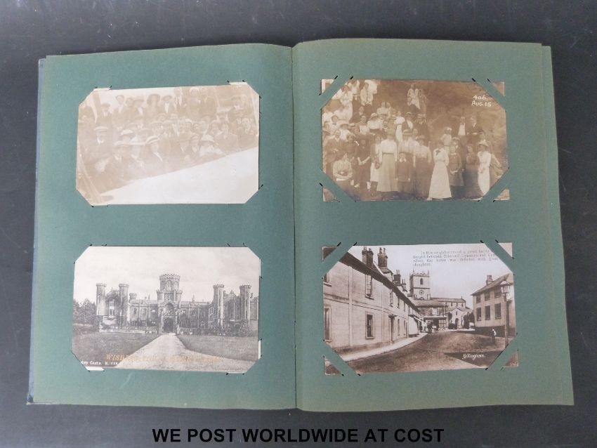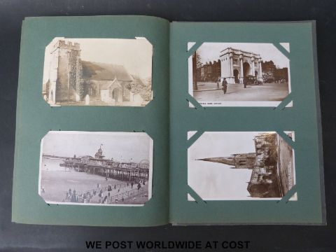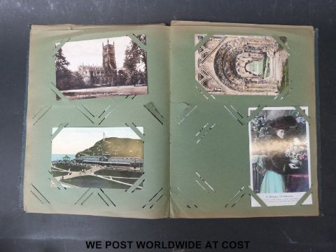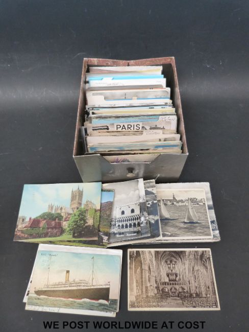 A large collection of various circa early 20thC postcards in a box and two albums including Cunard, topographical etc