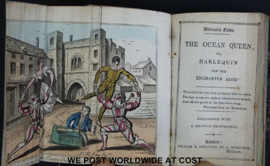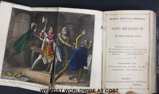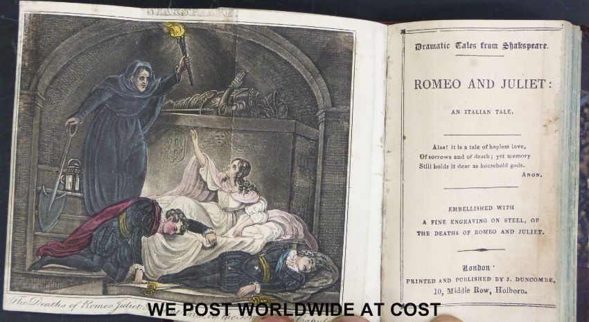 The Duncombe miniature library 'Dramatic Tales' eight stories in two volumes including 'Hop O' My Thumb and His Brothers, or 'Harlequin and the Ogre; A Fairy Tale, Harlequin and 'The Witch of Edmonton', 'Hamlet and King Richard' (London, J.Duncombe, c1835-40) half burgundy leather, gilt spine. All coloured lithographs intact.
