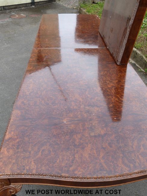 A very large burr walnut veneered extending dining table with carved decoration, raised on cabriole legs (maximum 375cm, minimum length 300cm, width 101cm)