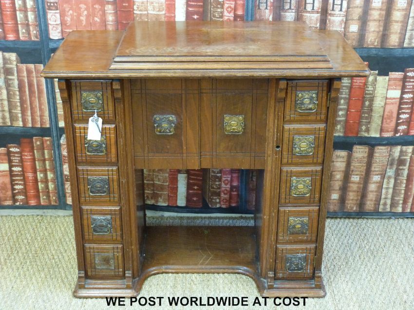 A mahogany desk converted from a sewing machine table with five drawers to either side (H73 x W75 x D41cm)