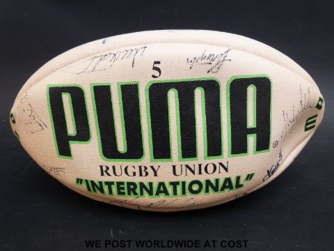 A rugby ball believed to have been signed by the British and Irish Lions, including Jeremy Guscott, Mike Catt, Nigel Redman, Gareth Chilcott, Martin Haay and Tony Swift, approximately 30 signatures in total