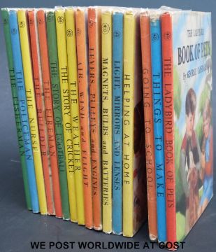 A collection of titles about different professions in the Ladybird series. Titles include The Fireman, The Builder, The Nurse, The Fisherman and Ladybird titles; How to Make things, Magnets, Bulbs and Batteries, Levers, Pulleys and Engines, Light, Mirrors and Lenses