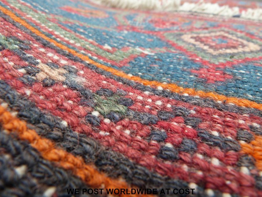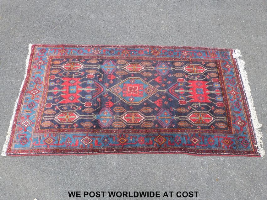A red ground rug with diamond medallions to the centre, together with a blue circular rug