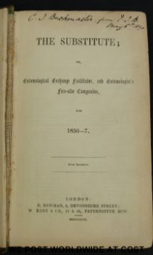 The Substitute: or Entomological Exchange Facilitator and Entomologists Fire-Side Companion for 1856-57 (London, E Newman, 1857) green impressed cloth