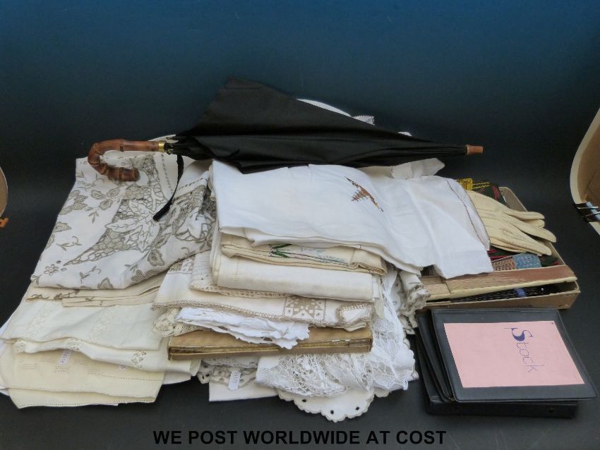 A collection of textiles to include kid gloves, Agnes Pascal silk scarf, Swiss linen handkerchiefs, collar stays, vintage fans, mixed linen and lace, Paragon Fox & Co umbrella/parasol