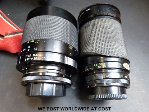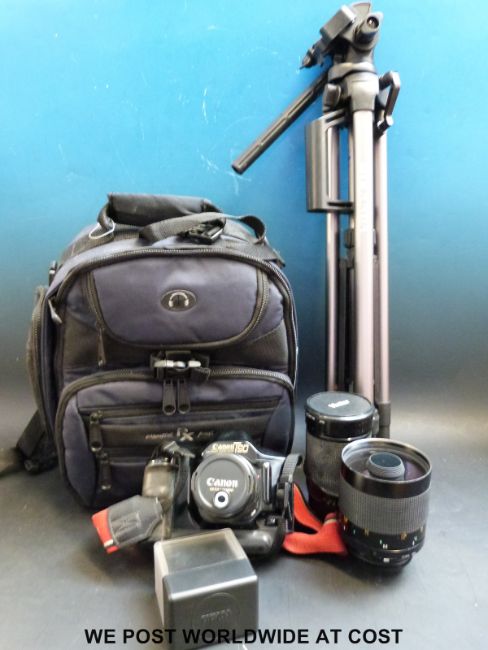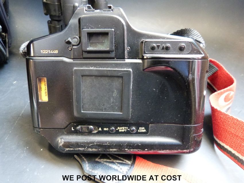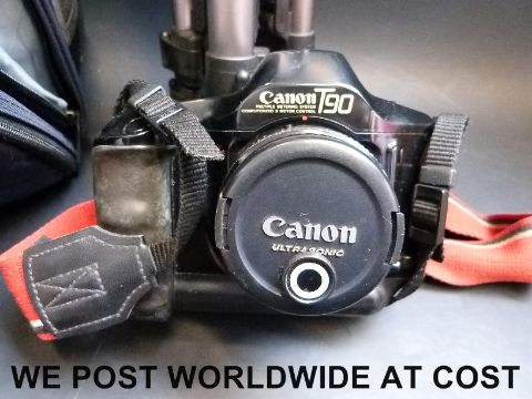 A Canon T90 camera in carry case with accessories, tripod and a collection of other vintage cameras and lenses etc