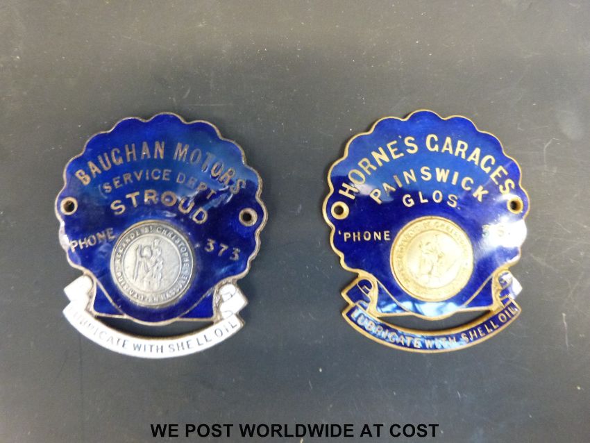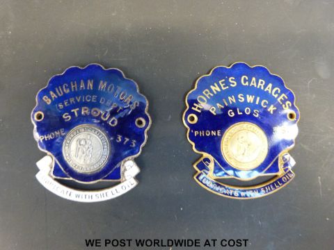 Two local interest Shell vintage car dashboard badges, one for Horne's Garage, Painswick, and the other for Baughan Motors (Stroud)
