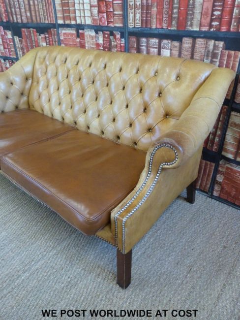 A pair of leather Chesterfield sofas with button backs and metal stud decoration, raised on wooden legs