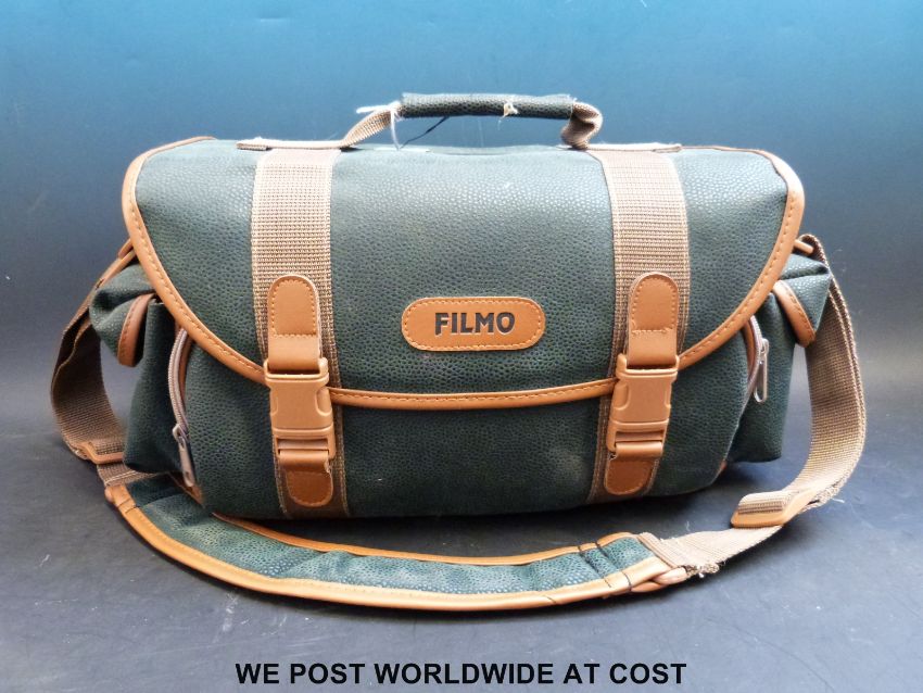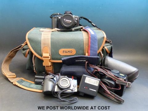 Vintage cameras and lenses etc including a Canon eos 500 with lens, Olympus etc and a Filmo case