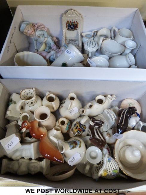 A collection of crested ware, animal figures, bisque children wall plaques