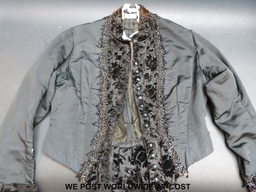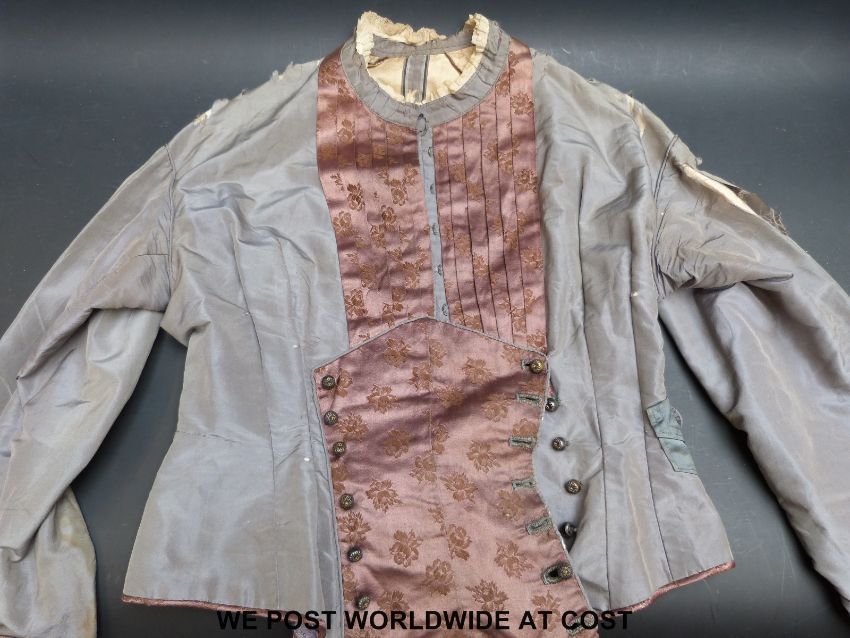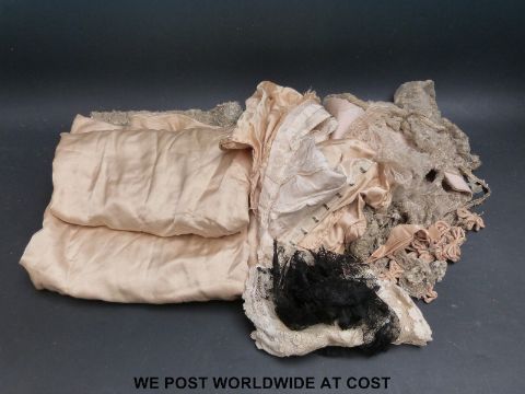 A circa 1900 silk dress with remnants of lace overdress, a peach dress, a black silk and lace blouse and a similar pale grey example, black silk petticoat with lace neck flounces