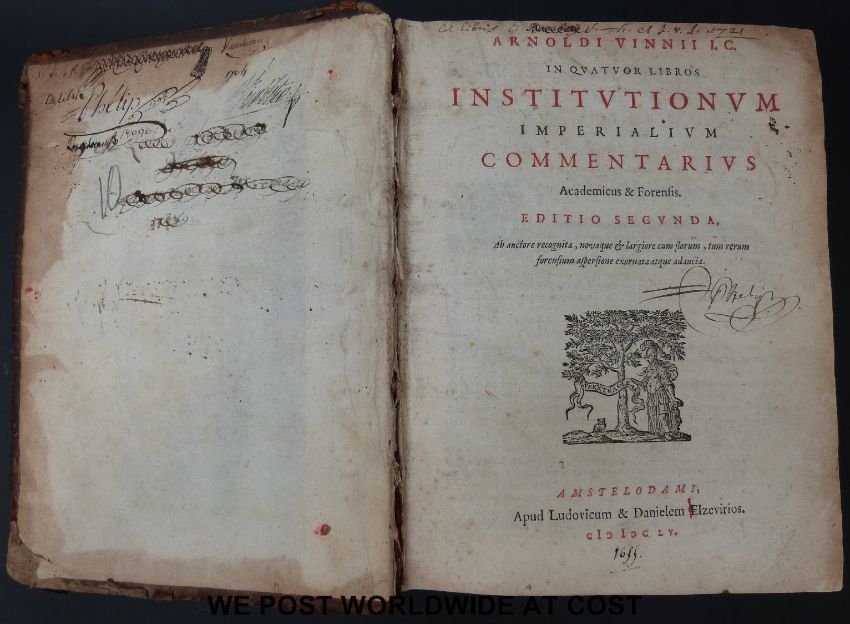 Arnold Vinnii, In Quatuor Libros Institutionum Imperialium Commentiarius Academicus and Forensis (1655 edition) full leather boards, raised band to spine