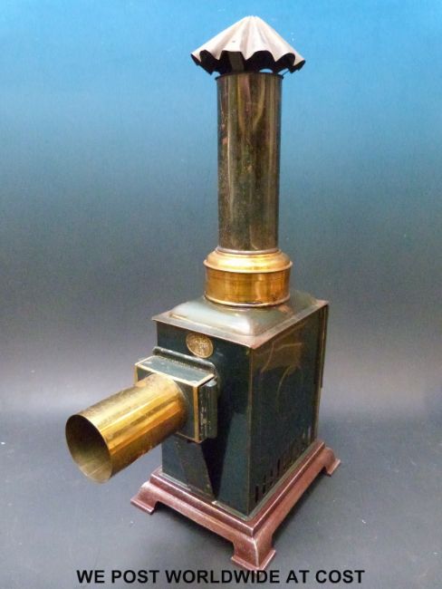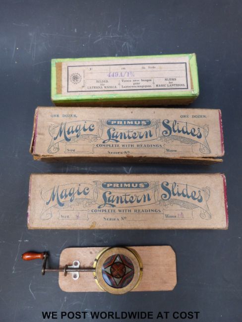 An Ernest Plank magic lantern from 1900 together with box and slides, includes a mechanical example