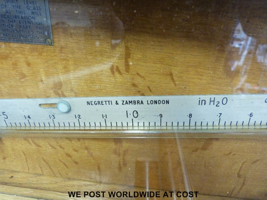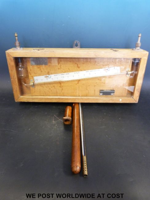 A Negretti & Zambra liquid gauge together with a brass thermometer in a wooden case