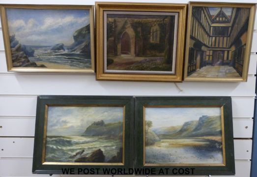 Five oils on canvas, all monogrammed E.T. comprising two architectural studies, two coastal seascapes and one of a loch scene (largest 24 x 34cm)