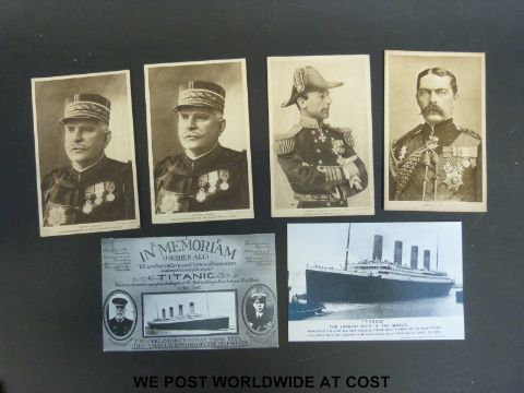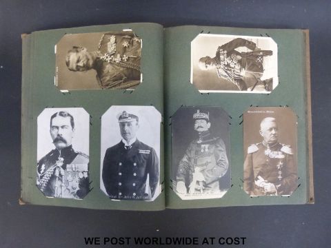 An album of WWI postcards comprising approximately 140 British, French and German black and white and coloured postcards, includes Royal Flying Corps, early tanks, war leaders, Gabrielle Petit monument & photo, Edith Cavell grave