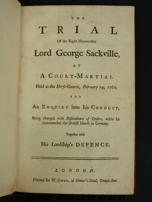 The Trials of the R.H.Lord George Sackville at A Court-martial Held at Horse Guards, February 29, 1760 (London, W.Owen) half leather boards, complete with map and overlays