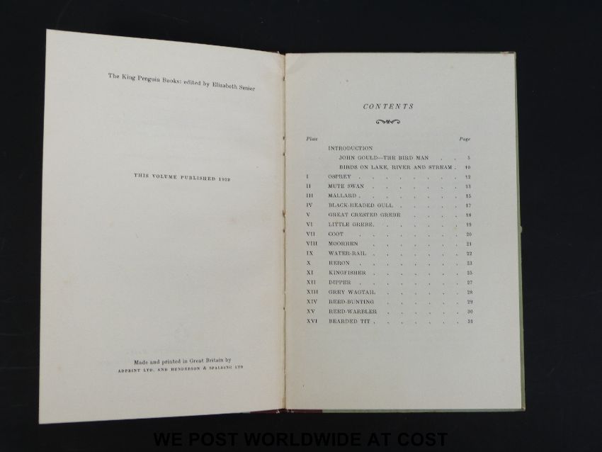 A collection of King Penquin First Editions not issued with dust jackets. Titles include British Birds on Lake, River and Stream (1939), A Book of Roses (1939), Fashion and Fashion plates 1800-1900 (1943) and Wood Engravings by Thomas Bewick (1947). Numbers are KP1, 2, 6, 7, 9, 10, 12, 15, 16, 20, 28, 30, 46 and 48