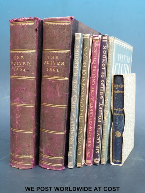 Two volumes of The Quiver (1891 & 1894) Red half leather boards with gilt spine together with four volumes of Britain in Pictures series and Robert Louis Stevenson, Virginibus Puersque (London, Thomas Nelson) with slipcase.