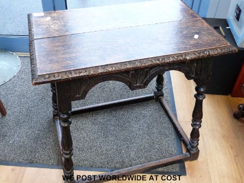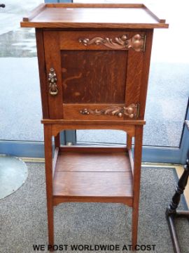 An Arts and Crafts oak cabinet on stand with copper decoration together with an oak side table with carved decoration (H62 x W66 x D44cm)