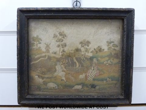 An 18th/19thC embroidery of a man playing a musical instrument to a lady in a countryside setting with farm animals (19 x 23cm)