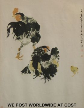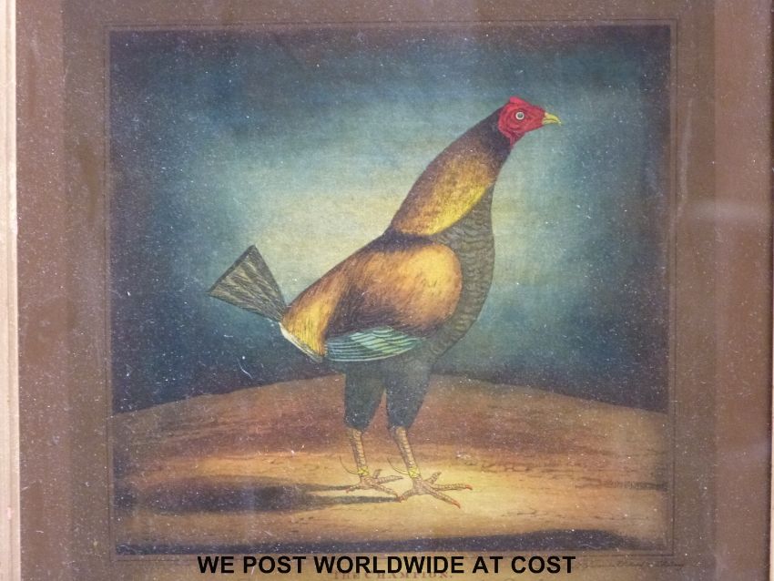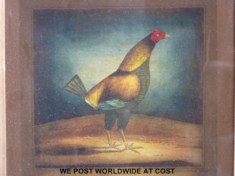 A female nude in charcoal indistinctly signed lower right (40cm x 24cm), together with a quantity of other prints including oil of flowers and a pair of paintings on glass of cockerels