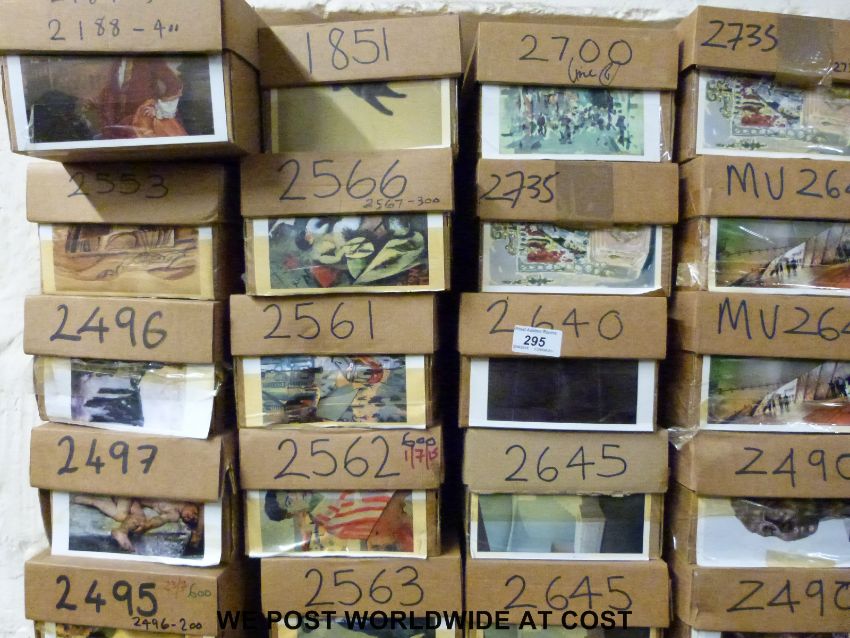 Approximately 107,000 postcards, contained in 107 boxes, each look to be a different design