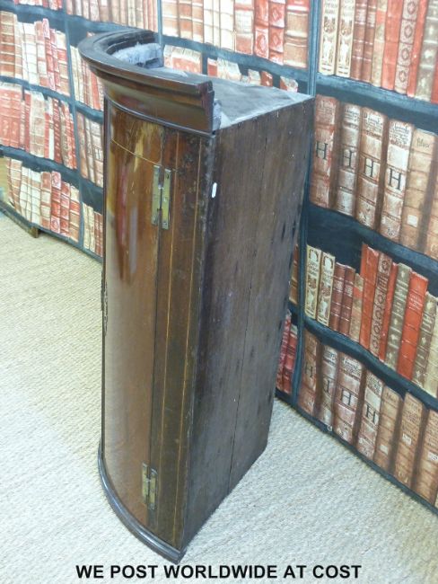 A Georgian bow fronted mahogany corner cupboard with brass hinges (H107 x W75 x D51cm)