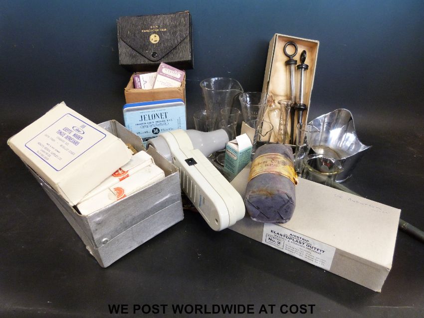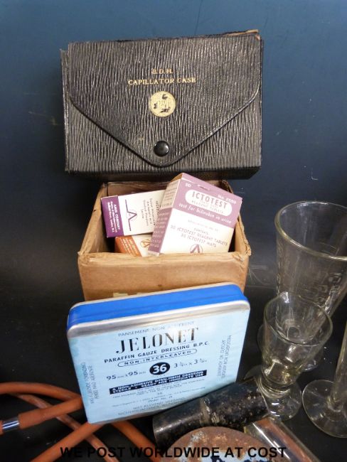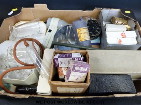 A collection of largely nursing related articles and equipment including dressings, urine testing, irrigation, a sputum bowl, specimen vials etc