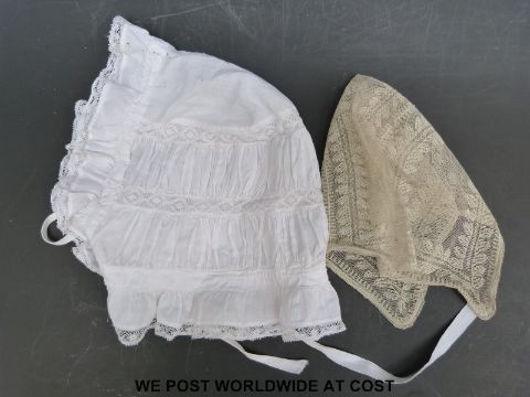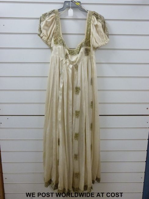 A cream embroidered silk dress, probably Regency and two lace caps