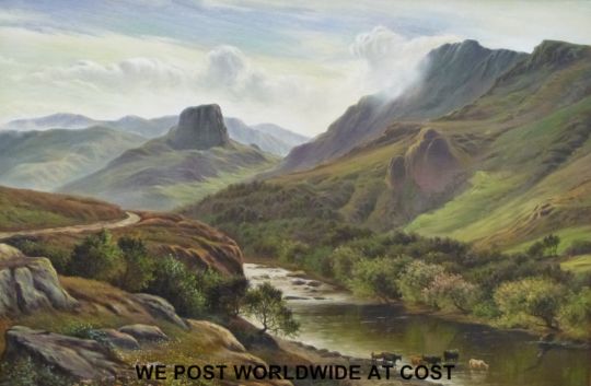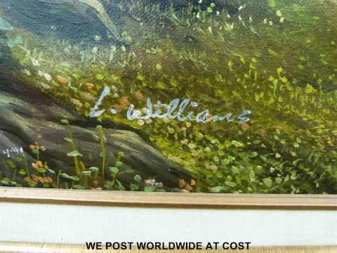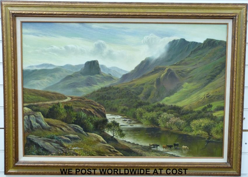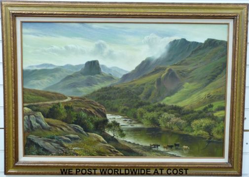 L Williams oil on canvas of Highland landscape with cattle in river valley below (60cm x 90cm)