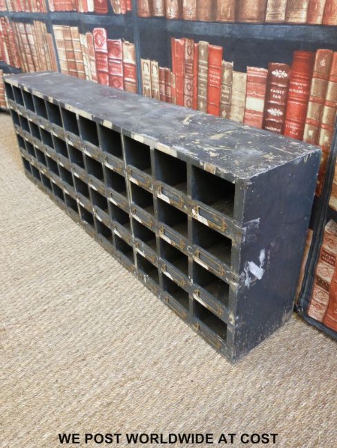 A vintage set of shopfitting / haberdashery / engineer's wooden cubby holes with brass ticket pockets, 44 sections (H46 x W140 x D22cm)
