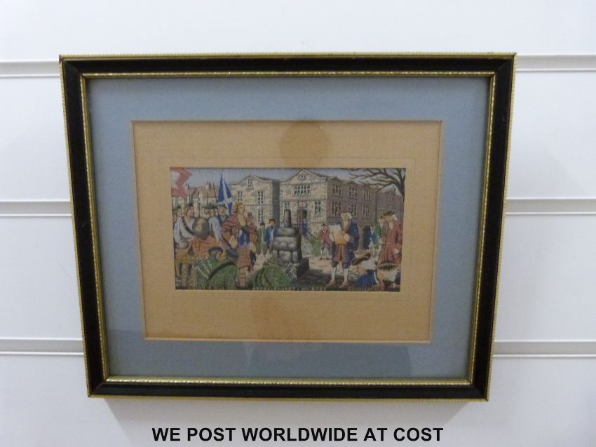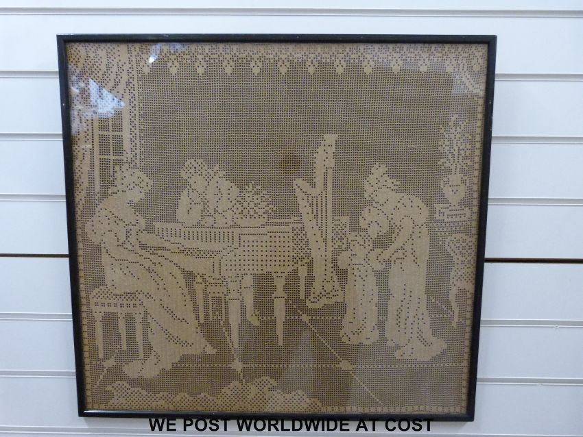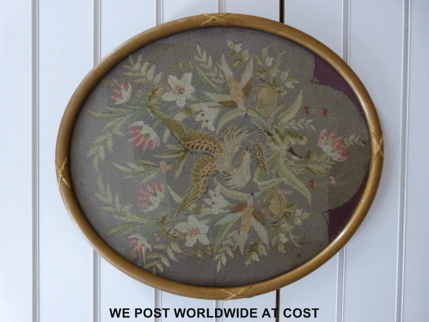 A large framed needlework or lace picture of a lady playing a piano, a framed silk picture of Brocklehurst-Whiston, Macclesfield dated 1954 and a 20thC embroidery of birds in a oval frame together with one other