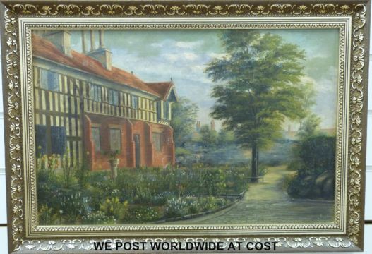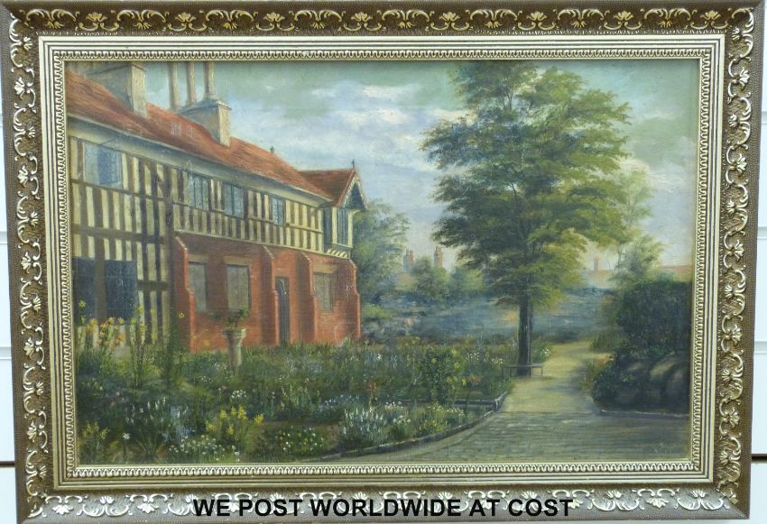 Oil on canvas of a half timbered house, indistinctly monogrammed E T 1902 (34cm x 52cm)
