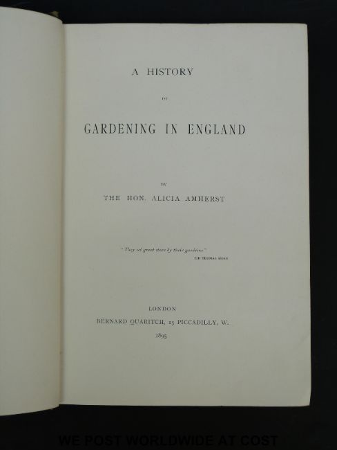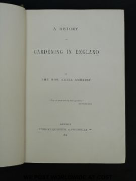 Hon Alicia Amherst, A History of Gardening in England (London, Bernard Quaritch, 1895) green cloth with gilt impressed design to the front board and spine. First edition, 4to, xvi and 398 + (2)pp. Sixty-five illustrations, engravings and photographs
