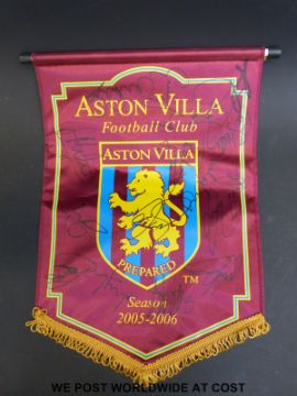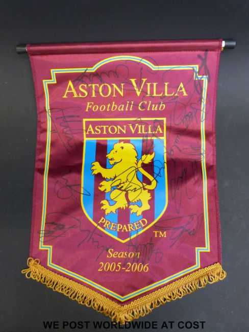 A signed Aston Villa pennant for 2005-2006 season and a quantity of football programmes. Signatures on the pennant (19 in all) include Milan Baros, Lee Heudrie, Luke Moore and Steve Davis