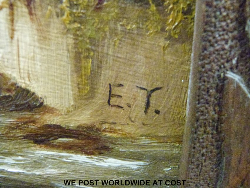 Oil on canvas of a bridge over a river, monogrammed E T (50cm x 29cm)