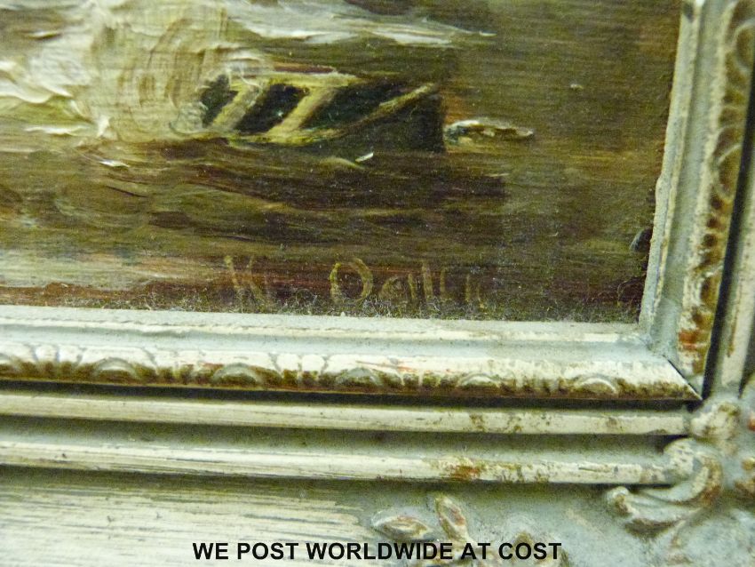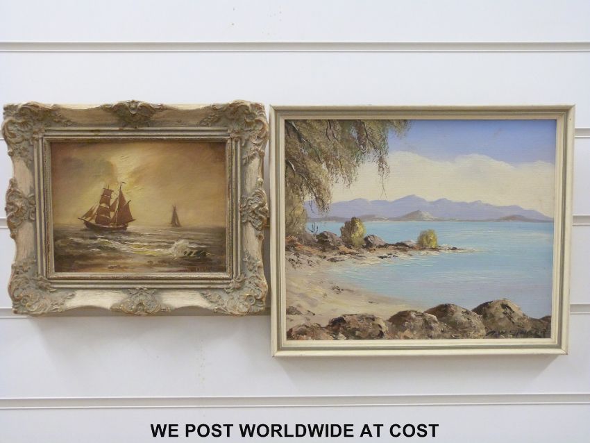 A W Singer acrylic on board of a coastal scene (24.5 x 29.5cm) together with a William Ogilvie oil on board of ships near the coast in ornate frame (14.5 x 19cm)