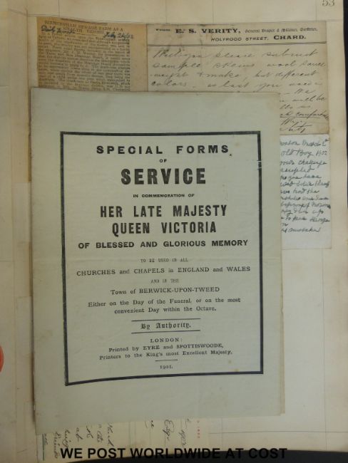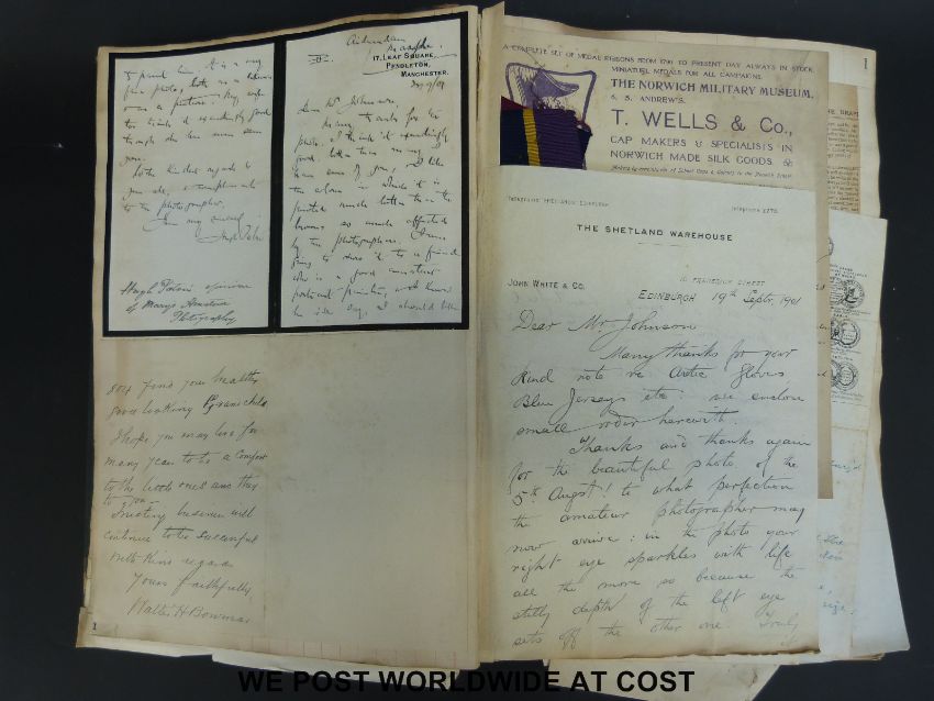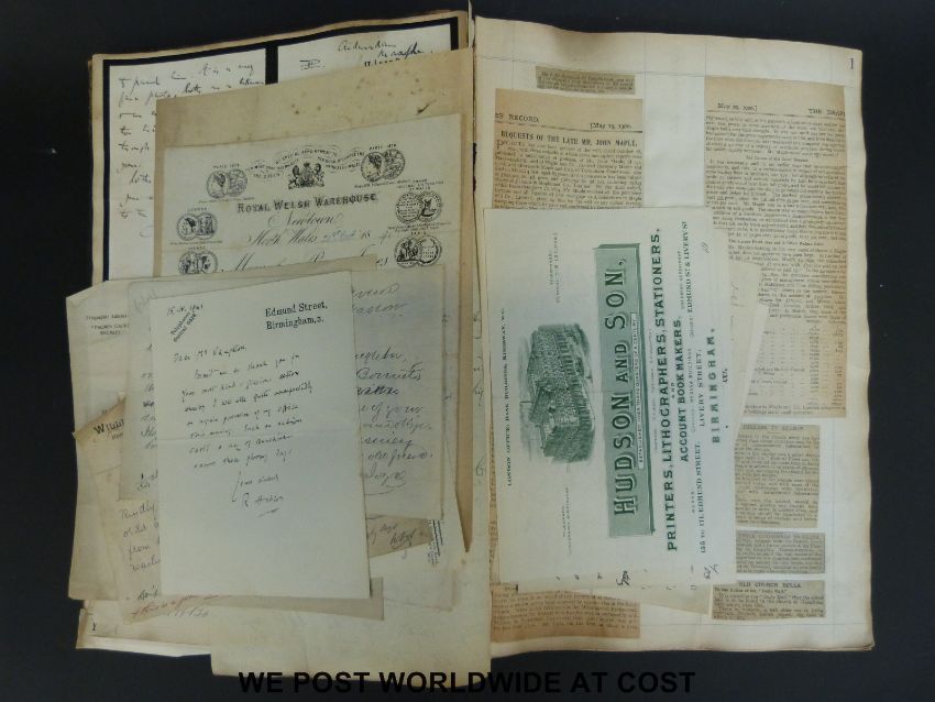 An album of late 19thC/early 20thC letters, cuttings etc relating to Johnson Drapers, including correspondence with Harrods, Frederick Gorringe, Shoolbred, mention of 'The Warwickshire HomeKnit' and other products, adverts, cuttings etc