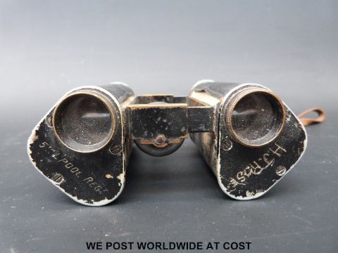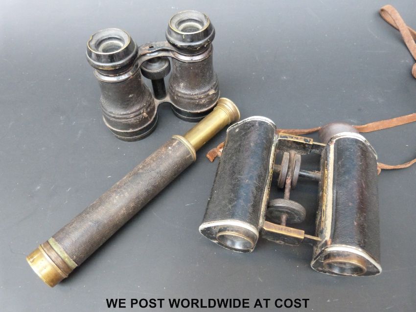 A cased pair of cWWI binoculars by Goertz, Berlin, army and navy binoculars and a small brass telescope
