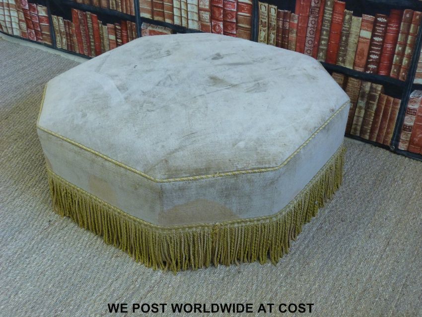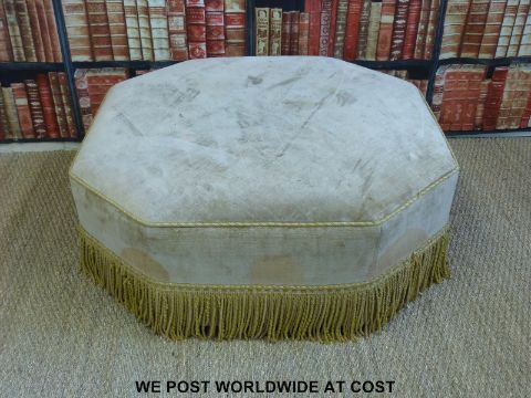A large octagonal upholstered pouffe with fringed edge (H40 x W 106 x D106cm)